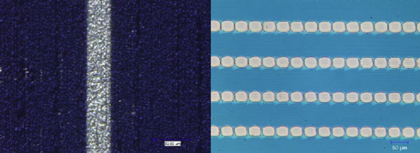 皮秒激光劃片和切割先前已成功用于 c-Si 太陽能電池的生產(chǎn),例如通過 SiN 鈍化層創(chuàng)建開口以允許與有源半導(dǎo)體層直接電連接。在某些情況下,應(yīng)用程序需要一個長的連續(xù)凹槽。這可以通過使用具有高斯輪廓的光束然后重疊脈沖來創(chuàng)建 - 參見圖 3(左)。然而,一些 SiN on Si 劃線應(yīng)用需要避免任何脈沖重疊,以完全避免對底層硅的任何損壞。圖 3(右)顯示了一個示例,該示例使用具有均勻輪廓的光束,該光束使用頂帽式光學(xué)元件成形。此處顯示的(<100 nm 厚度)SiN 中緊密間隔的方孔證實 ps 激光也不會對 SiN 造成橫向熱損傷。在這些單脈沖應(yīng)用中,ps 激光器的高重復(fù)頻率(高達 5 MHz)意味著限制因素是掃描速度。振鏡掃描儀可以提供高達 30 m/s 的速度,相當(dāng)于 100 萬個孔/秒。更快的多邊形掃描儀可以將速度提高到幾百萬個孔/秒。